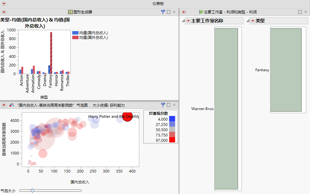 在右报表中,您可以看到 Warner Bros 和独立制片公司制作了大多数“科幻”影片。在底部报表中,您可以看到 Harry Potter 是最为赚钱的“科幻”影片。