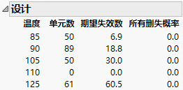 基于检验试验的水平、要试验的最小单元数、要试验的单元总数(即“候选试验”分级显示项中的信息)以及您指定的其他信息来计算最优设计。最优设计会在每个温度水平下试验以下单元数: