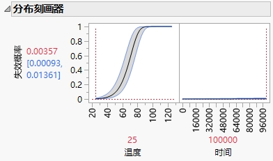 1. 在“分布刻画器”中,为“温度”输入 25,为“时间”输入 100,000。失效的总体比例估计值为 0.00357,95% 置信区间为 0.00093 到 0.01361。该区间比最初实验中的区间(介于 0.00056 到 0.02268 之间,如电容模型的分布刻画器 所示)要窄。