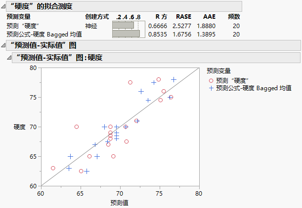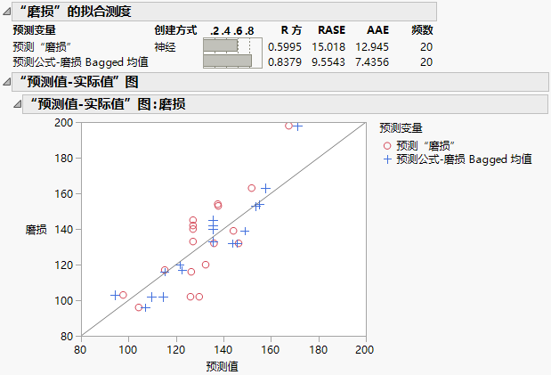 “拟合测度”报表和“预测值-实际值”图显示在磨损预测的比较 中。从 Bagging 得到的预测用蓝色显示。从原始神经网络模型得到的预测用红色显示。通常,Bagging 预测比原始模型预测更接近实际线。因为 Bagging 预测更接近实际线,因此 Bagged 预测的 R 方值 0.6699 高于原始模型预测的 R 方值。您得出结论:Bagging 改进了磨损的预测。