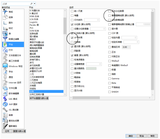每个平台报表窗口都具有可以打开或关闭的选项。但是,您对这些选项所做的更改在您下次使用该平台时不会被记住。若您希望 JMP 记住您每次使用平台时所做的更改,可以在“首选项”窗口中更改相应的选项。