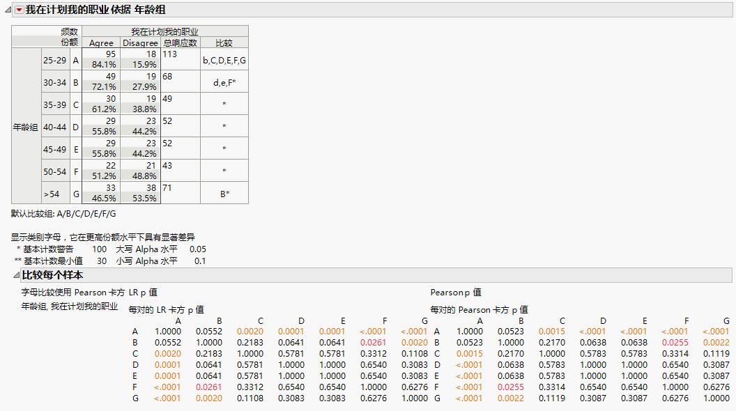 交叉表汇总了各年龄组之间关于“我在计划我的职业”的这一陈述。该表的单元格包含各个年龄组中同意或不同意这一陈述的响应者频数(计数)和份额(百分比)。此外,交叉表还包括比较字母。每个组在“比较”列中都标有一个字母,该字母位于组标签右侧。“比较”列中的字母支持您解释组间独立性统计测试的结果。