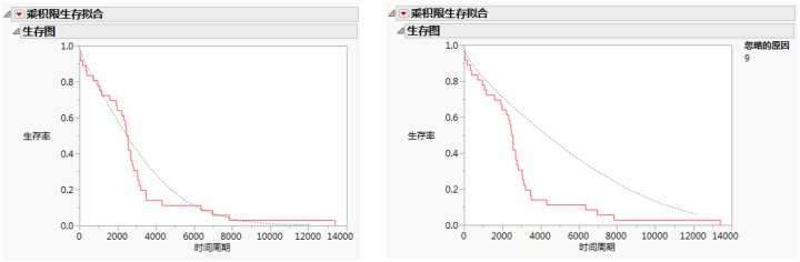 具有忽略原因的生存图 显示了具有所有竞争原因的生存图和没有原因 9 的生存图。您可以看到不含原因 9 的生存率(用虚线表示)在 2,000 个周期前没有大的改进。之后,该生存率变得好许多,甚至在 10,000 个周期后仍有改进。