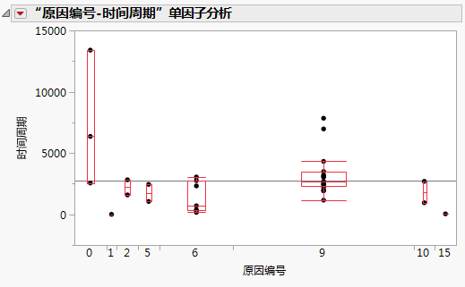 在本例中,大多数失效是由于原因 9 造成的。原因 1 只出现过一次且不能生成好的 Weibull 估计值。原因 15 出现的时间很短而且导致很小的 beta 和很大的 alpha。回想一下 alpha 是失效时间的 63.2% 分位数估计值,这意味着前期失效的原因通常有很大的 alpha。若这些原因不导致前期失效,则也通常不会导致后期失效。