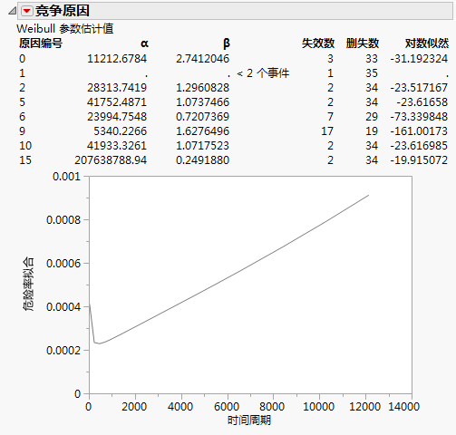 整个系统的生存分布仅是生存概率之积。“竞争原因”表显示每个失效原因的 Alpha 和 Beta 的 Weibull 估计值。