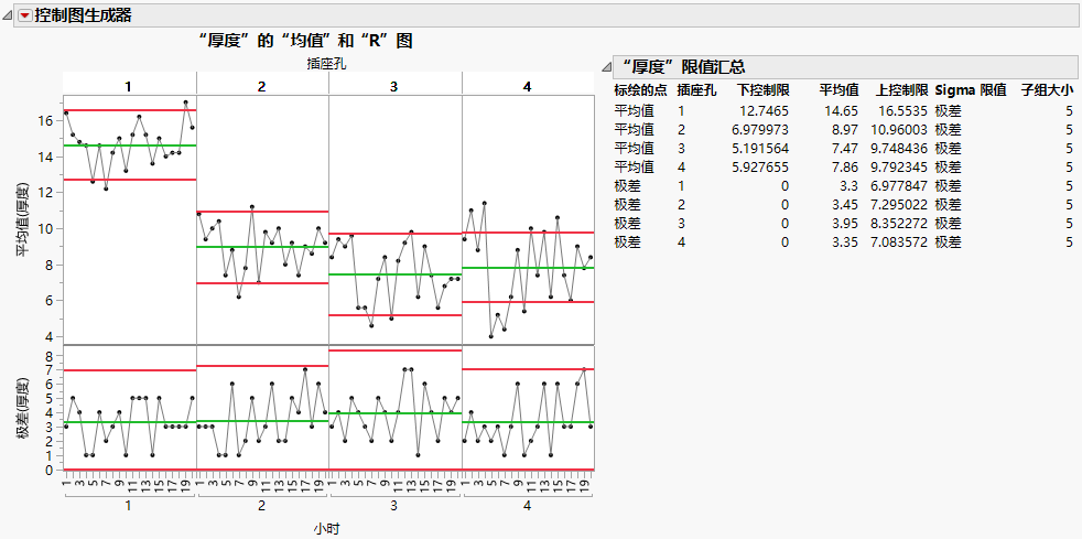每个插座孔的极差图显示子组内测量值处在受控状态。