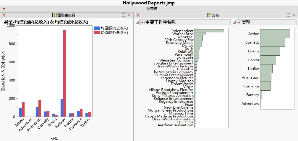 2. 运行名为“分布: 主要工作室 - 利润和类型 - 利润”和“图形生成器: 类型 - 全球和国内总收入”的表脚本。