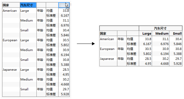 现在您的表已清晰显示数据。更容易查看按汽车尺寸和产地细分的车主年龄的均值和标准差。