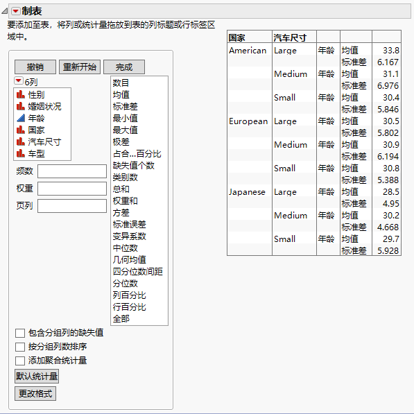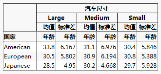 假定您要查看拥有每种汽车尺寸的人员的年龄均值(平均值)和标准差。