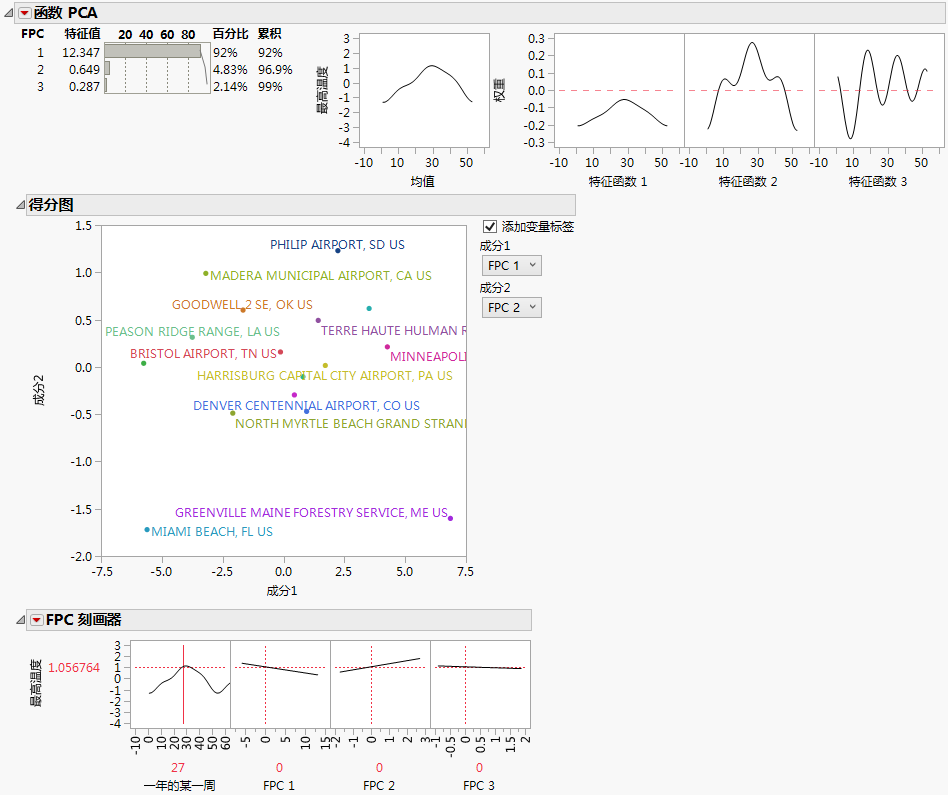 “傅里叶基函数”报表包含几个报表,这些报表包含有关所选模型的信息。在“模型选择”报表中,显示的模型是根据 BIC 拟合准则最佳的拟合模型。对于气象数据,选择的“傅里叶基函数”模型的期间为 53 并且具有三个基函数对。还提供该模型的拟合统计量和系数。向下滚动以查看“函数 PCA”报表。