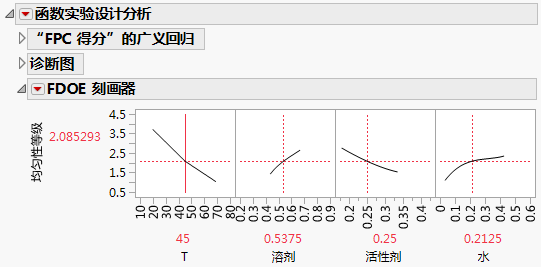 “FDOE 刻画器”支持您基于您实际关注的预测变量探索均匀性等级如何变化。通常,均匀性等级看起来随着活性剂数量的增加而减少。