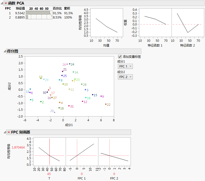 “函数 PCA”报表显示:需要两个函数主成分来解释数据中的变异。“FPC 刻画器”显示在不同温度下均匀性等级如何受 FPC 影响。不过,没有办法说明实际成分如何影响均匀性等级。