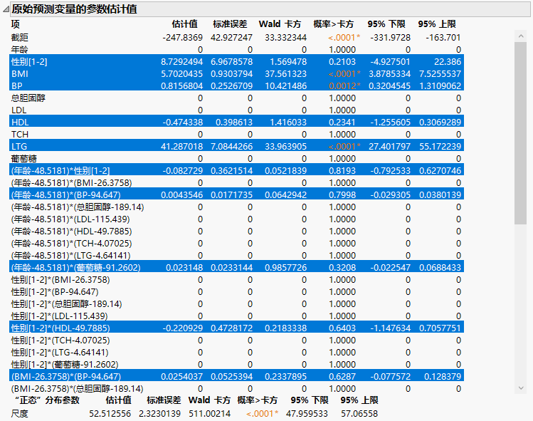 该选项突出显示“原始预测变量的参数估计值”报表(“原始预测变量的参数估计值”报表的一部分)中的非零项和它们在“解路径”图中的路径。同时选定数据表中的对应列。请注意,在 55 个参数估计值中,只有 11 个是非零的。同时还估计了正态分布的尺度参数 (sigma),它显示在“原始数据的参数估计值”报表底部的单独表中。请注意,这 55 个参数估计值并不是全部都显示在“原始预测变量的参数估计值”报表的一部分 中。
