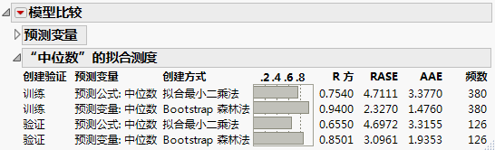 构建模型使用的是训练集中的行,所以“创建验证 = 训练”对应的 R 方统计量可能会有些虚高。在这种情况下,统计量不能代表模型的预测能力。这对于 Bootstrap 森林法模型尤其如此。