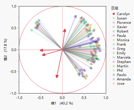 ‒ 在载荷图中,左下象限中的射线对应于 Carolyn。这些射线指示 Carolyn 与其他评级员之间存在差异。