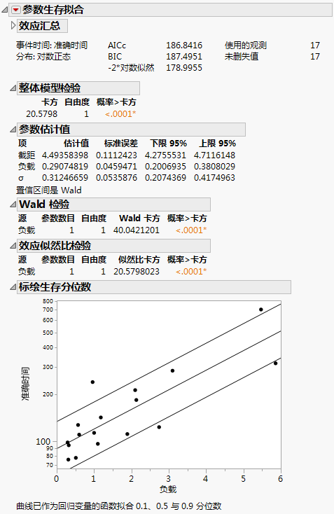 当 90% 的作业是在系统负载 5 下完成时需要使用时间分位数。请参见 Meeker and Escobar (1998, p. 438)。