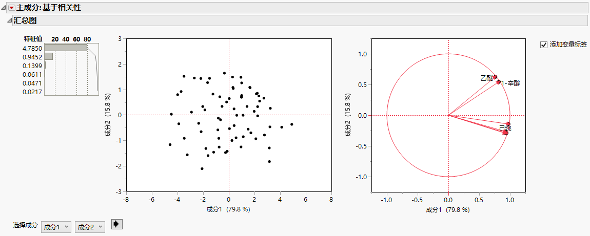 该报表提供特征值和一个条形图,图中显示了每个主成分所解释的变异百分比。在本例中,第一个主成分解释数据中大约 80% 的变异。前两个主成分一起,共同解释了数据中几乎全部的变异 (95.5%)。同时还有一个“得分图”和一个“载荷图”。请参见“主成分”报表。