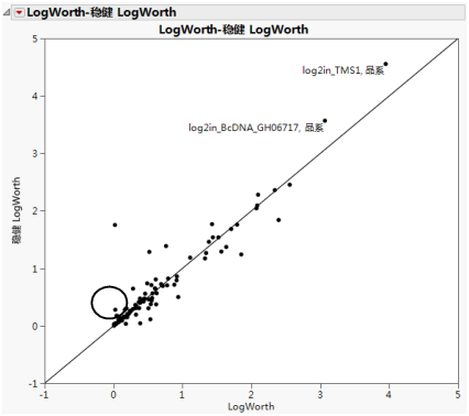 该图显示在Drosophila 数据的“LogWorth-稳健 LogWorth” 中。若响应的稳健检验与常规检验相同,则它的对应点将位于Drosophila 数据的“LogWorth-稳健 LogWorth” 中的对角线上。图中带圆圈的点不在对角线附近,因为它的稳健 LogWorth 值超过了 LogWorth 值。