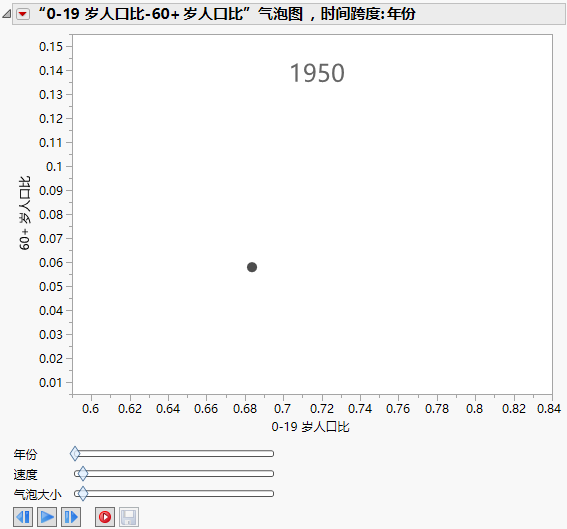 对于动态气泡图,您可以仅指定一个时间变量而不指定任何 ID 变量。生成的气泡图包含一个移动气泡,该气泡可随着时间值的更改跟踪数据序列。