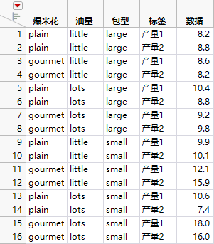 1. 选择帮助 > 样本数据库,然后打开 Popcorn Trials.jmp。