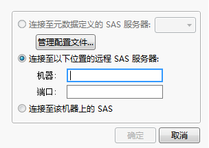 6. 在连接至 SAS 服务器窗口中(连接至 SAS 服务器),选择连接至 SAS 的方法(若您尚未连接)。对于该示例,选择连接至该机器上的 SAS。