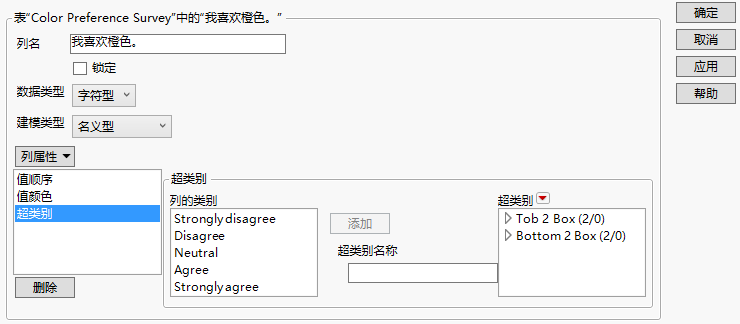 6. 在“超类别”下,为列类别选择不同意和完全不同意。