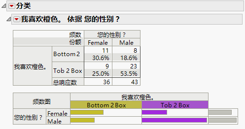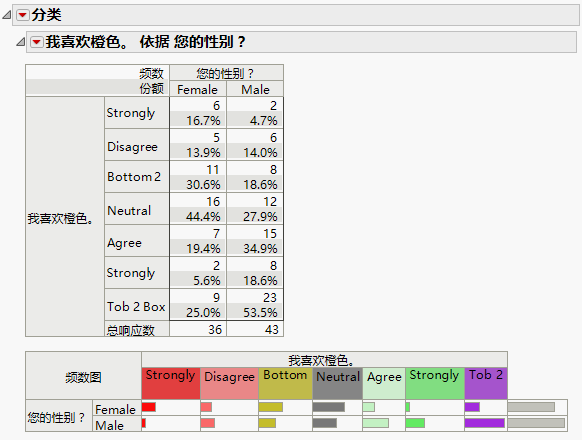 交叉表包含两个额外行,每个超类别一行。这些超类别还包含在频数图中。请注意,Top 2 Box 行中的频数统计是“同意”和“完全同意”类别中计数的总和。Bottom 2 Box 行中的频数统计是“不同意”和“完全不同意”类别中计数的总和。
