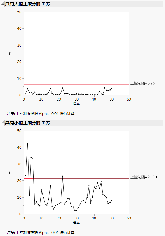 对比“主成分”报表,“具有大的主成分的 T 方”图(仅反映第一个成分的变异)显示不出来存在特殊原因的证据。“具有小的主成分的 T 方”图显示特殊原因存在于其余更小的成分中。这些更小的成分没有解释很多变异,很可能表示随机噪声。因此,您可以认定厚度测量值中的变异不是值得关注的主要原因。