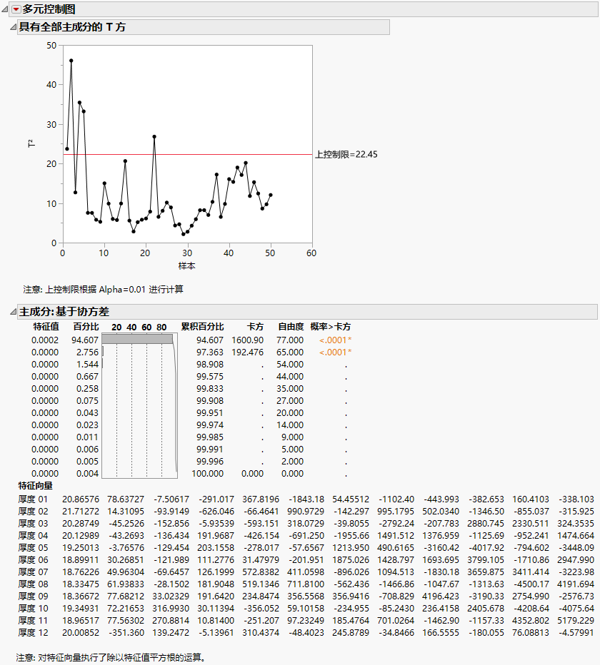 Thickness.jmp 的初始多元控制图 中的总控制图指示特殊原因影响了钢筋条 1、2、4、5 和 22。通过查看“主成分”报表,您可以看到第一个主成分解释了 12 个厚度测量值中几乎 95% 的变异。您想进一步调查与该主成分相关的变异。
