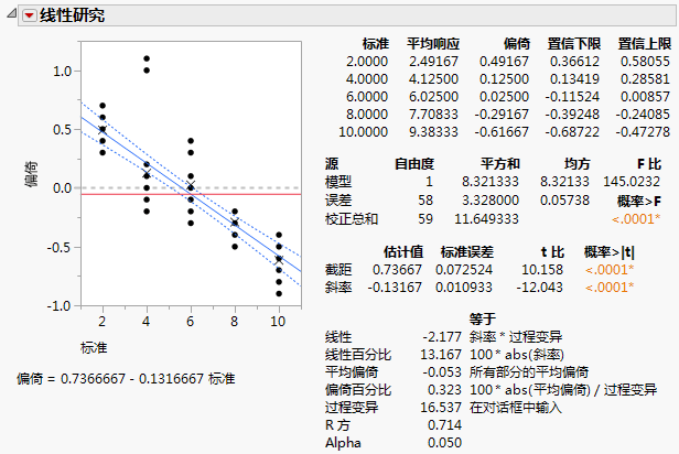 因为 p 值很小,您可以推断部件大小与操作员测量它们的能力之间存在显著的线性关系。您还可以在图中看到这一点。若部件或标准值很小,则偏倚很高,反之亦然。