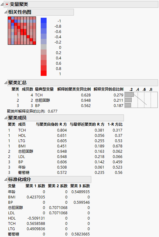 • “聚类 1”包括 BMI、HDL、TCH 和 LTG,如“聚类成员”报表中所示。“聚类汇总”报表显示 TCH 是对于“聚类 1”最典型的变量,而且对于“聚类 1”中的变量,62.8% 的变异是由第一个主成分解释的。