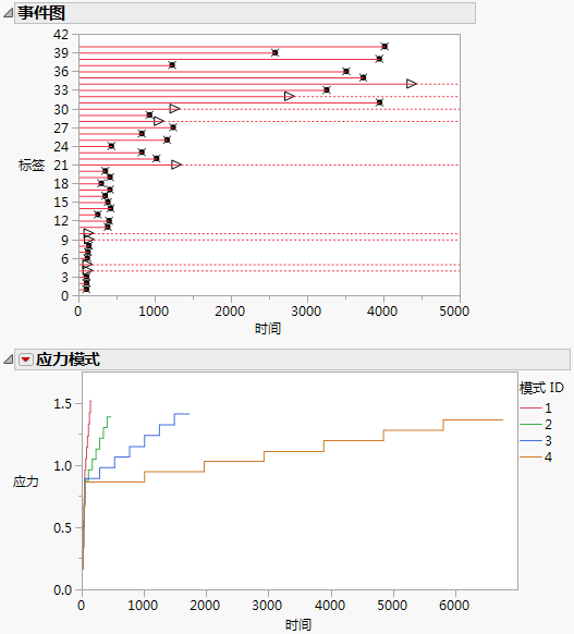 初始报表包含事件图和定义的应力模式图。全部四种应力模式都沿着前 40 个时间单位快速提升应力水平,这之后它们的提升速度显著不同。