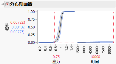采用指定设置的指数分布的分布刻画器 显示在 10000 个时间单位时,处于稳定不变应力 (0.75) 下的某个检验单元的失效预测概率为 0.007233,95% 置信区间介于 0.00137 到 0.03775 之间。