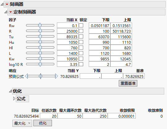 优化过程找到 221.66 处的最佳预测响应。为了获得 221.66 处的最优值,Rw 和 Kw 均设置为其最大值,L 设置为其最小值。最优值大于初始“基准”值 70.83。