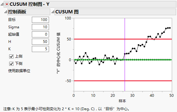 类似于在使用 sigma 单位的示例中那样,CUSUM 图上的垂线指示温度测量值中的偏移大约从样本 26 开始。