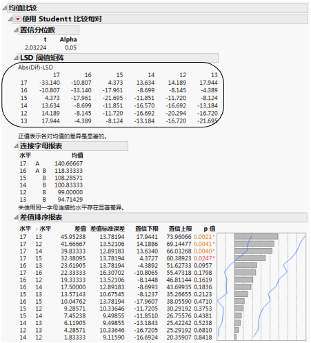 在“每对,Student t”的均值比较报表示例 中,LSD 阈值表显示均值的绝对差值与 LSD(最小显著性差异)之间的差值。若值为正数,则两个均值之间的差值大于 LSD,说明这两个组存在显著差异。