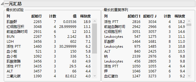“一元汇总”报表汇总了在所有列中找到的最长的试验和最长的重复序列。每个表都是按“稀缺度”排序,“稀缺度”计算的是试验或序列偶然出现的可能性。针对“最长的试验”稀缺度得分最高的列是肌酸酐,而针对“最长的重复序列”稀缺度得分最高的列是活性 PTT。您将在“一元模式”报表中对这些列进行进一步检查。