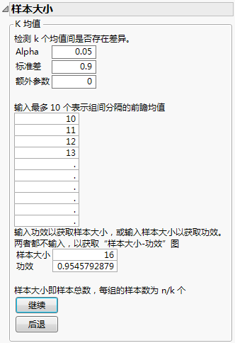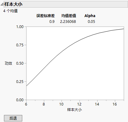 计算出的功效大约为 0.95。这意味着:假定总体均值为 10、11、12 和 13,标准差为 0.9,总样本大小为 16 时,在 0.05 显著性水平下有 95% 的机会检测出至少有一个均值不同。