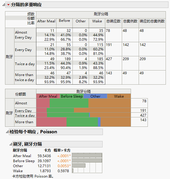 p 值显示 After Meal、Before Sleep 和 Other 的响应率在各个刷牙组之间显著不同。Wake 的响应率在各个刷牙组之间没有显著不同。从交叉表中,您可以看到多数人都在起床后刷牙,不论他们刷几次。