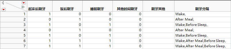 请注意,刷牙分隔列包含多重响应问题的响应。每个响应由逗号分隔。刷牙分隔之前的四列包含以四种数据格式显示的相同信息。每列(睡醒刷牙、饭后刷牙、睡前刷牙与其他时间刷牙)都包含一个响应。若选择了该响应,则列值为 1,否则为 0。