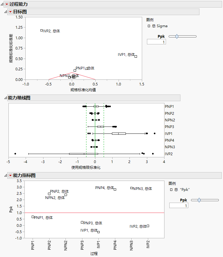 目标图为每个变量在 x 轴上显示规格标准化均值偏移,在 y 轴上显示规格标准化标准差。图下方中心处红线定义的三角区域是目标三角形。它定义了能力指标值的区域。您可以使用图右侧的 Ppk 滑块来调整目标三角形。当滑块设置为 1 时,请注意 PNP1、PNP3、IVP1 和 IVP2 均位于目标三角形之外,所以很可能超出规格范围。