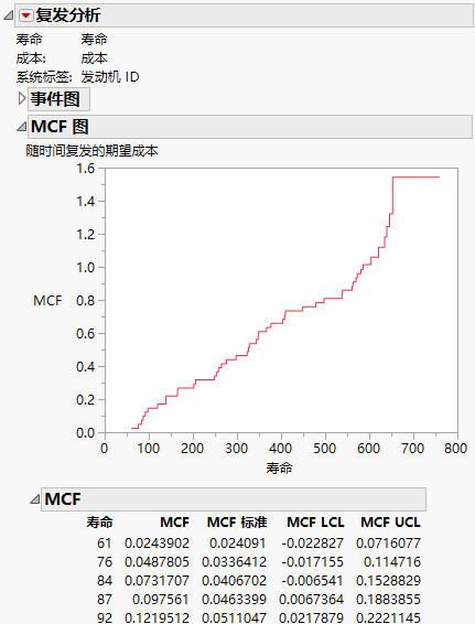 当您点击确定后,“复发”平台将显示复发分析的 MCF 图和部分表内容 和气门座更换的事件图中的报表。MCF 图显示样本平均累积函数。对于每个寿命,它是平均累积成本的非参数估计值或每单元事件数。该函数随单元老化和总成本增加而增长。复发分析的 MCF 图和部分表内容 中的图显示平均一次维修事件大约能维持单元工作 580 天。