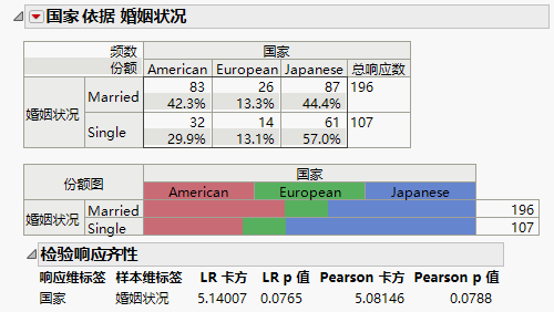 本例使用 Car Poll.jmp 样本数据表,其中包含从轿车所有权的调查中收集的数据。数据中包括有关调查的个人的人口统计信息以及他们轿车的相关信息。您想要了解婚姻状况与轿车原产地之间的关系。还想要检验响应齐性。也就是说,您想要通过检验来判定轿车原产地的分布针对已婚和单身响应者来说分布是否相同。