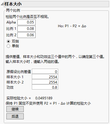 假定您负责两条硅晶片装配线。根据很多次试验的了解,其中一条装配线的缺陷率为 8%,另一条装配线的缺陷率为 6%。您想知道在功效为 80% 时得出缺陷率有差异结论所需的样本大小。