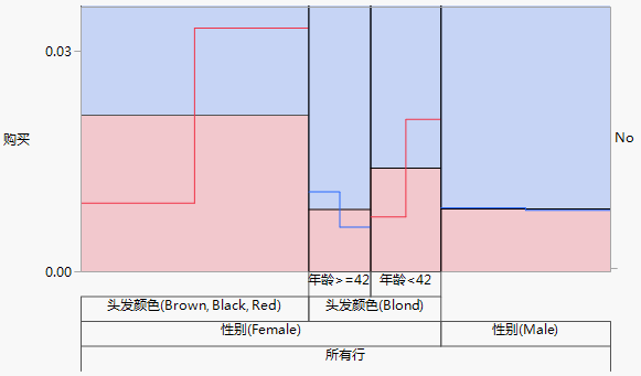 该图形显示购买的提升发生在具有黑色、红色或棕色头发的女性群体中或具有淡黄色头发的更年轻的女性(年龄 < 42)会员中。对于男性会员和年龄更大的淡黄色头发的女性会员(年龄 ³ 42),促销具有负面影响。