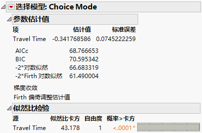 负的系数意味着旅行时间的增加对于消费者效用或满意度有负面影响。似然比检验结果表明包含“旅行时间”效应的“交通方式”模型是显著的。