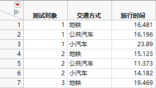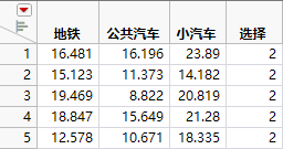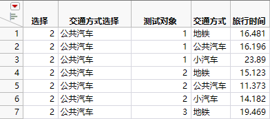 3. 从 Daganzo Trip.jmp 数据中,选择测试对象和交通方式选择列。