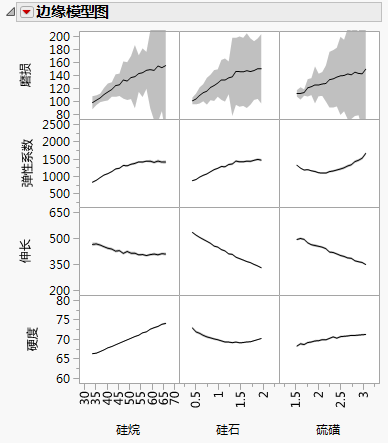 “边缘模型图”报表显示每个因子在另外两个因子设置的均匀分布中的响应均值。