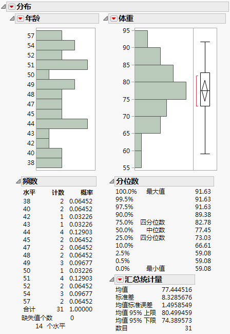 尽管年龄和体重都是数值变量,但它们的处理方式不同。体重和年龄 的结果 比较体重和年龄结果的差异。