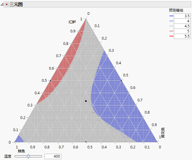 在该示例中,红色着色区域显示等级为 5 到 5.5 的鱼混料。任意紫色区域显示等级为 4 或更低的鱼混料。在 400 度时,大部分为红鲈和鲻鱼、只含少量黄花鱼的混料会得到 5 或更高的等级。